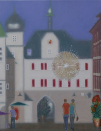 Den auslöser zu diesem bild haben die optiker-meister und geschäftsinhaber Doris und Andi Wilhelm gedrückt. Wer gute brillen verkauft, braucht auch kurzsichtige (oder weitsichtige) menschen. Ein kurzsichtiger ohne brille sieht die welt unscharf, möglicherweise so, wie Phlip Barlow sie interpretiert. Ich gehe einen etwas anderen weg: es gibt in meinem bild keine scharfen linien, keine klaren umrisse, nur sanfte farbübergänge. Alles scheint 'schwammig' oder wie in auflösung begriffen. Eine besondere ausnahme bilden starke lichtreflexe, wie die in einer fensterscheibe gespiegelten sonnenstrahlen. Hier bildet sich im gehirn des kurzsichtigen betrachters eine corona, ein lichtkranz, der aus sehr feinen hellen und klaren strahlen besteht. Ob materie angesichts dieser vielschichtigkeit eine illusion ist, könnte an anderer stelle erörtert werden.
