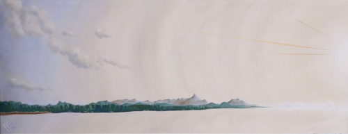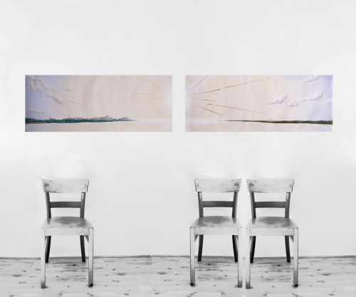 Die beiden bilder simsseelicht I und II bilden ein diptychon, sie sollen also beieinander bleiben und nebeneinander hängen. Ich hätte das motiv auch auf eine 2,7 meter breite leinwand malen können. Dann allerdings hätte ich die mitte darstellen müssen. Aber das unbeschreiblich helle licht in der mitte entzieht sich jeder beschreibung und damit auch der darstellung. Du musst es dir vor-stellen. Dann ist es dein licht.