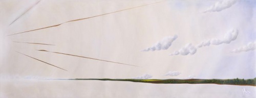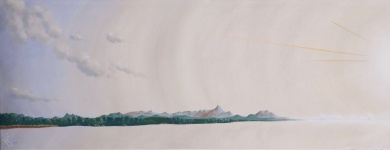 Der simssee im licht – der illusion zweiter teil? Dein blick, lieber betrachter, wandert im zweiten teil des diptychons vom hellen licht, das sein zentrum zwischen den beiden bildteilen hat, zum nordufer des simssees. Hinter der lichten bewaldung schwingen sanft bewaldete hügel und farbige felder. Und doch scheint auch hier etwas fremd zu sein. … Es fehlen hier wie auch im ersten bildteil die spiegelungen im wasser. Wasser? Welches wasser? Schalte einfach den verstand aus und versuche, die beiden bildteile mit den augen eines fremden in der welt, eines neugeborenen zu betrachten.