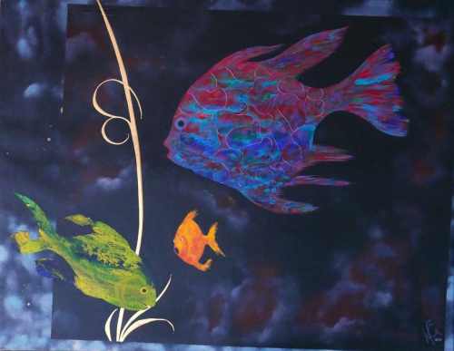 Dieses bild mit rätselhaftem titel „v3“ ist der abschluss einer trilogie, deren motive von vorneherein fest geplant waren. Das erste von drei bildern habe ich im jahr 2017 gemalt und die idee zu dieser 'erzählung in bildern' liegt noch länger zurück. Und doch hätte dieses gemälde in keine situation besser gepasst als in die jetzige. v3 folgt – wie fantasievoll ;) – auf v1 und v2. Sie ist ein abschluss. Ein guter abschluss. Ein ruhiger und friedvoller. Anders als beim triptychon, das die vergangenheit, die gegenwart und die zukunft zum gegenstand hat, bezieht sich meine 'v-trilogie' auf die vergangenheit und die gegenwart. v3 ist jetzt. Mit allen stimmungsfacetten, die meine drei fische in ihrer farbig schillernden pracht transportieren. Mit allen gefühlen, die bei dir als betrachterin und betrachter ankommen.