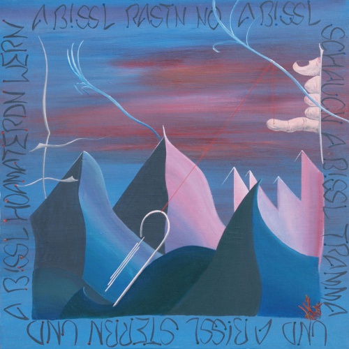 Die innschrift des bildes, die sich wie ein rahmen um das bergmotiv zieht, lautet: „a bissl rastn no, a bissl schaugn, a bissl tramma und a bissl sterbn und a bissl hoamat erdn wern“. Bei meinen vielen schlittentouren von der hohen asten hinunter kam ich in flintsbach immer an einem haus vorbei, das diesen sinnspruch an der giebelseite trägt. Er spiegelt meine 'freudige melancholie' zu dieser zeit wider.