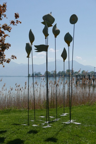 Bei sonnenschein und blauem himmel scheint es hier am cheimsee etwas gemütlicher zu sein als auf der ratzinger höhe. Die skulpturen fügen sich ein in die landschaft bei gstadt mit blick auf fraueninsel und hochgern.
