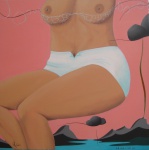 Den abschluss der serie 'bergfrauen' bildet die dame in weissen hotpants zu füssen des 'wendelsteins'. Gegenüber dem wendelstein liegt das 'kranzhorn' und zwischen den beiden zitiere ich aus meinem 'innportal': in tiefem türkis lasse ich den inn aus den bergen in den einstigen 'rosenheimer see' fliessen. In der darstellung der leicht bekleideten dame wird nochmal das surrealistische element aller frauendarstellungen dieser serie erkennbar: die dame sitzt – aber worauf? Die heuberg-dame steigt – aber welche stufe? Die hochries-frau besteht nur aus der silhouette – aber wie kann sie ihr zartes 'nichts' anziehen? Die kampenwand-frau – besteht sie nur aus gesäss und beinen? Die hochfelln-dame – hat sie den kopf verloren? Ich überlasse dich den rätseln. Neben dem rätselhaften verbindet alle bilder das 'wolken-thema' aus dunklen cumuli.